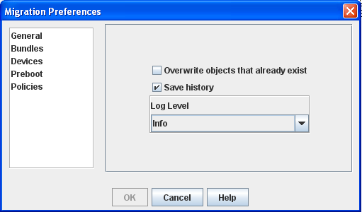 The Migration tool settings icon in the ZENworks Linux Management Migration Utility accesses the Migration Preferences dialog box, where you can specify the settings for the migration. Some categories might not have preferences.