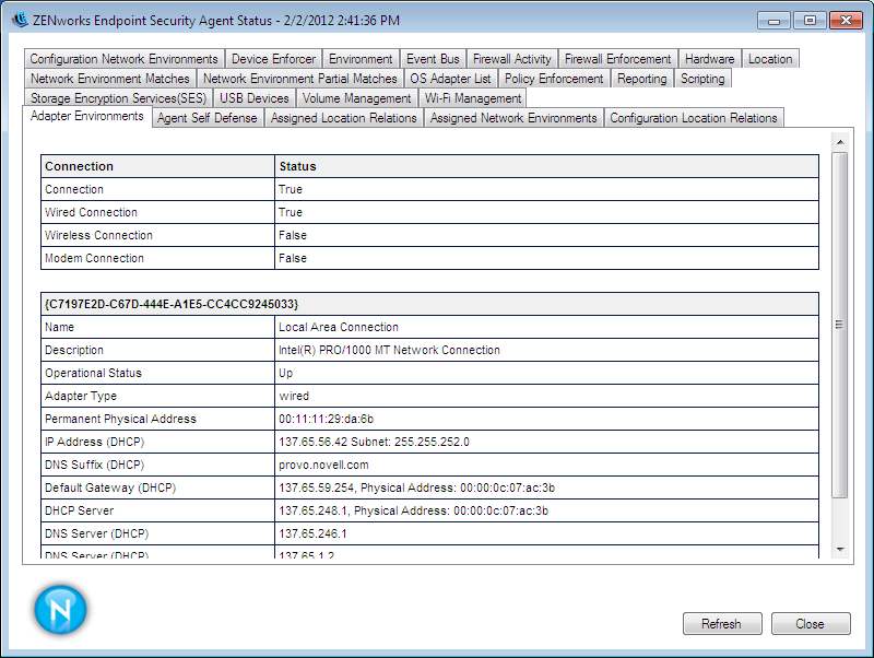 The Endpoint Security Agent provides a variety of status information related to the enforcment of security policies on the device. For example, the agent displays the current enforcement settings for the Firewall policy and resulting firewall activity. The agent also lists the detected USB devices and whether or not they can be accessed based on the USB Connectivity policy settings. This is just a small sample of the extensive status information available in the agent.