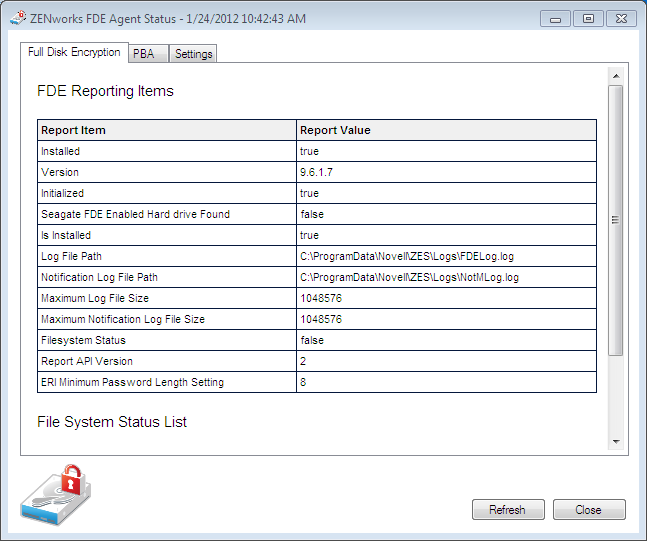 To view the agent status, you must know the FDE Admin password for the policy assigned to the device, or you must know the ZENworks Adaptive Agent override password or key. For more information about passwords, see Section B.0, Administrator Passwords.