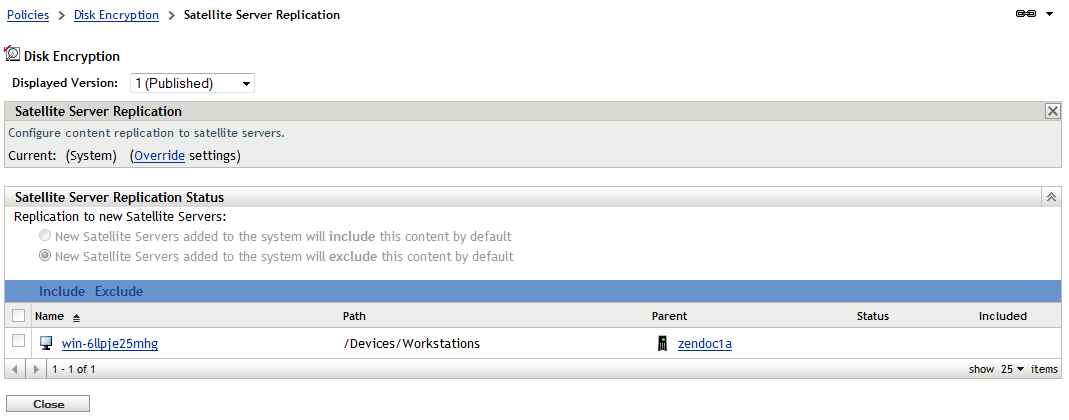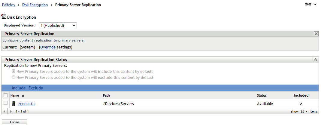 If you have multiple ZENworks Servers or Satellites functioning as content servers, you can choose to replicate a policy to all content servers or selected content servers. If a policy is not replicated to a content server, the policy is not available to any devices that connect to that content server for their policies.