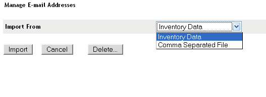If you select , the e-mail addresses found in an inventory scan will be imported. If you select , specify the file location in the field. Use the first name,middle name,last name,email address format to save the CSV file.