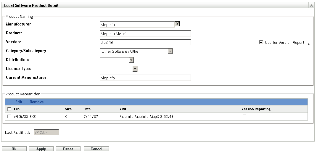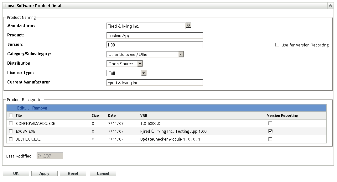 The Local Software Product Detail page shows details about the local software product and the files used to identify it. From here, you can edit the product information or the Version Recognition Block (VRB) data for the identifying files. If the file associated with the product does not contain Version Resource Block (VRB) information, the fields show “Unnamed.”