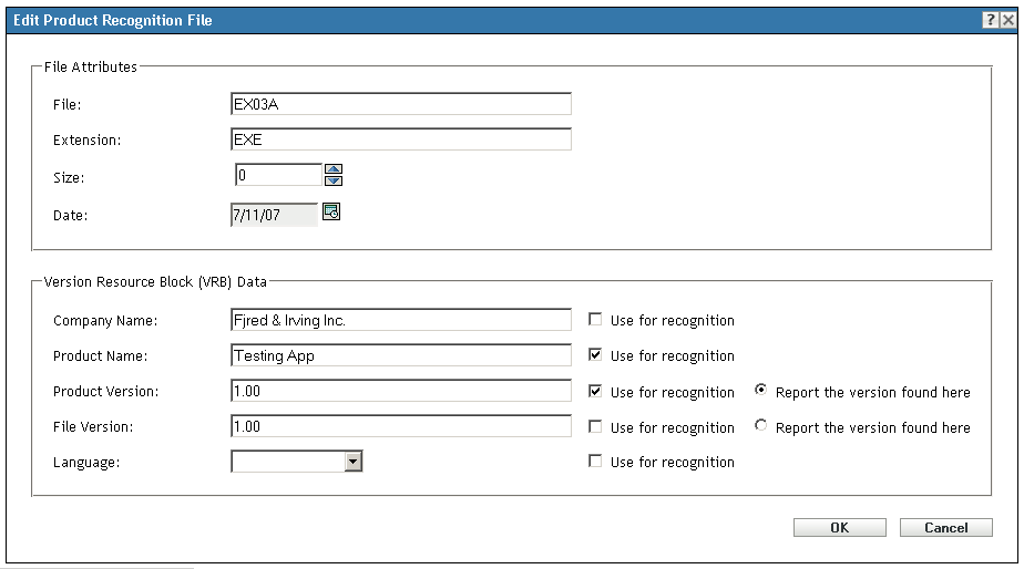 File Version: The version of the file. To use this data as part of the recognition criteria, select . To use the file version instead of the product version for recognition, select .
