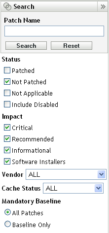Alternatively, you can view the baseline patches by using the Search panel on the Patches page to search for mandatory baseline patches.