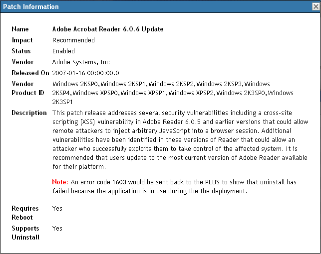 For example, if you select the patch called Adobe Acrobat Reader 6.0.6 Update from the list of patches, the Patch Information section displays the result of a patch analysis for the selected patch, as shown in the following figure: