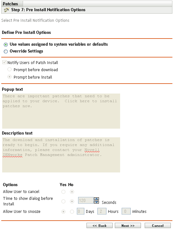 Notify Users Of Patch Install: Select this option to notify the user prior to the installation of the patch. There are two options: