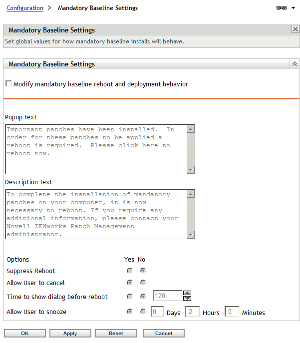The Mandatory Baseline Settings page allows you to completely control deployment of mandatory baseline patches. For example, you can decide whether or not to automatically reboot the machine when a baseline patch is applied. The page also enables you to set global options for installation of mandatory baseline patches.