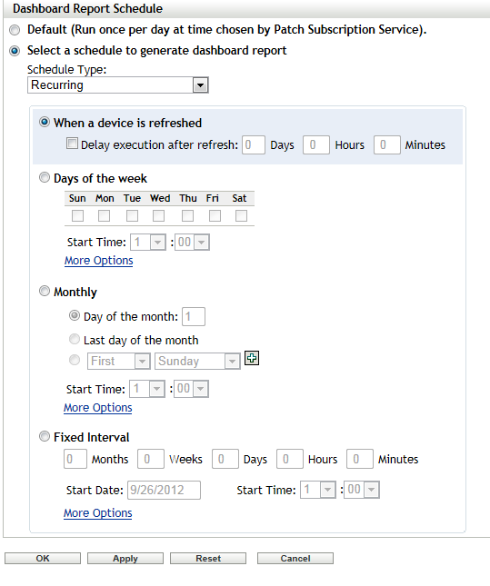 • Default: Selecting Default schedules the report at a time chosen by the Patch Subscription Service.