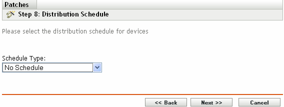 To start setting the distribution schedule, you need to select the schedule type. Patch Management offers three types of schedules to determine when the patches are actually distributed to the target device:
