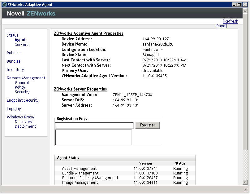 Status: Displays information such as the last time the agent contacted a ZENworks Server and whether or not the Agent features are running.