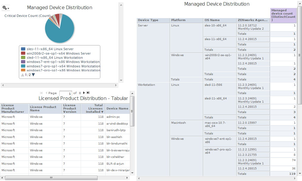 A ZENworks Reporting Dashboard displays various reports in a single integrated view. You can use Predefined reports or Ad hoc reports to create a dashboard. These dashboards can include other dashboards, input controls for choosing the data displayed in one or more frames, and custom frames that point to URLs for other content. By merging different types of related content, you can create attractive data-rich dashboards. You can view, create, and edit a dashboard only if you have the administrator rights.