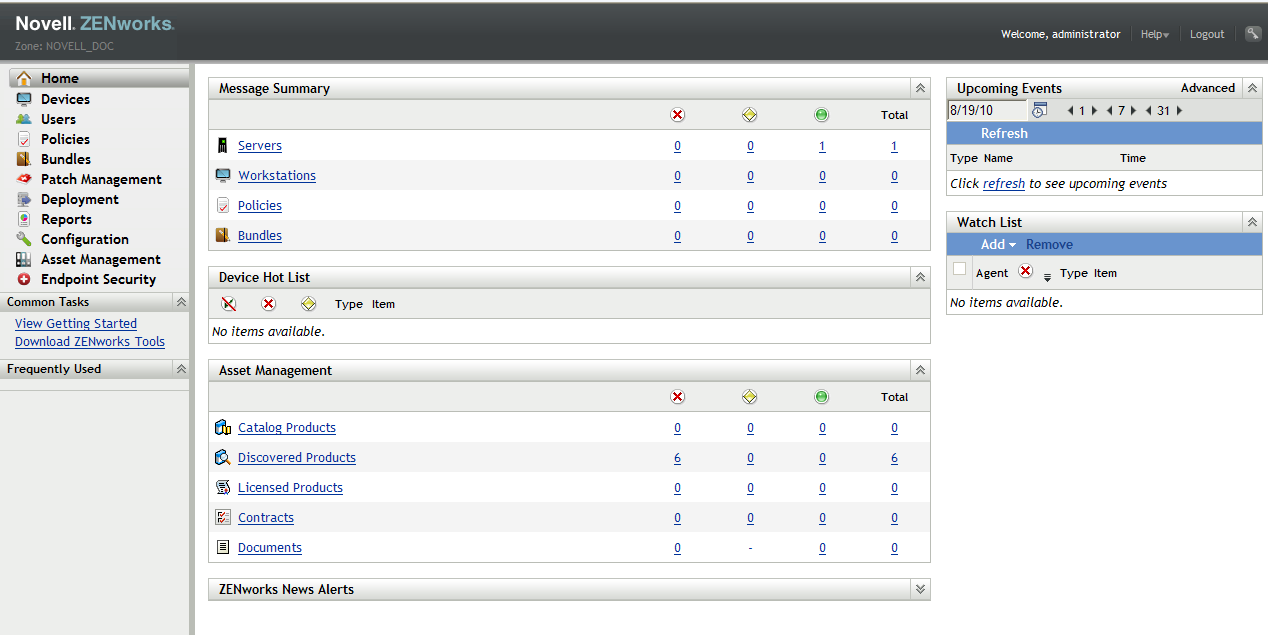 The Asset Management panel on the Home page lists the total number of properly licensed products (), underlicensed products (), and overlicensed products (). You can click a status to view the licensed products with that status.