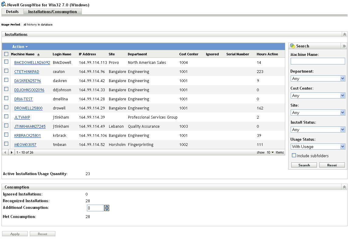 A discovered product’s Installation/Consumption page shows the number of usage hours for each installation.