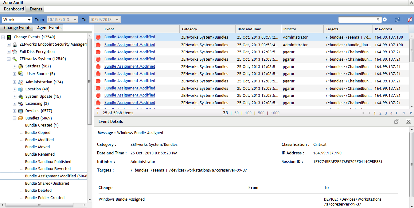 Events (Audit Log): This tab enables you to view all of the events that have occurred in the zone. The information is displayed in a format similar to the Events Configuration page. A count is displayed against those categories for which an event has been generated. For example, if a Bundle Assignment Management event has been generated, 1 is displayed against the Bundle Assignment Management category in the tree structure. When you click the event, the details of the event are displayed in the right pane.