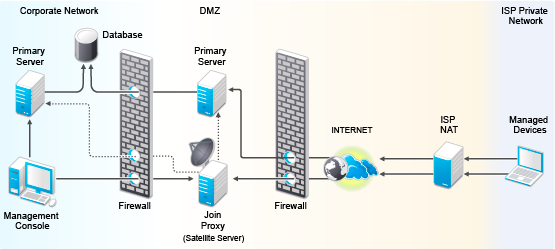 Join Proxy satellite server allows multiple Windows devices that are in a private network on the other side of a firewall or router that is behind NAT (Network Address Translation) to connect to it for remote management operations. Fore details, see Join Proxy Role