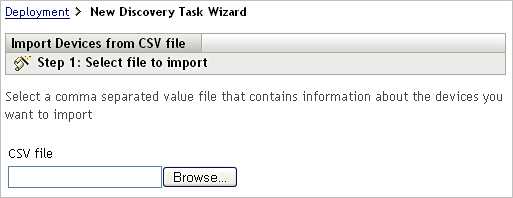 Browse for and select the CSV file that contains the devices you want to import. At a minimum, the CSV file must contain the DNS name or IP address for each device you want to import. |