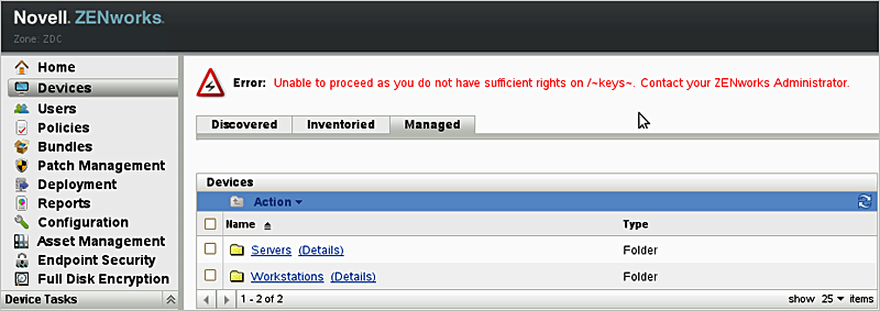 Unable to proceed as you do not have sufficient rights on /~keys~. Contact your ZENworks Administrator.