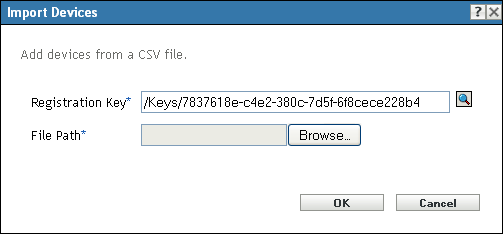 You can use the Import Devices dialog box to register one or more devices in the Management Zone by importing the information from a comma-separated value (CSV) file. Before importing the managed device, ensure that the registry keys have been created. Also ensure that there are limited and unlimited usage registration keys. You are allowed to execute the Import Managed Devices action regardless of whether you have registration rights or not, if you select an unlimited usage registration key.