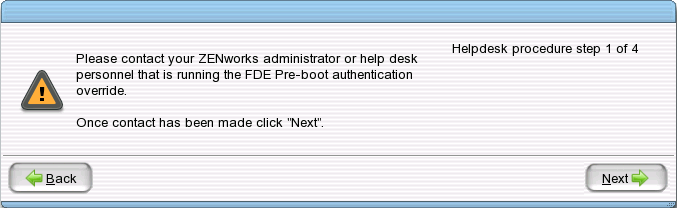 The following steps explain how to use the ZENworks PBA Helpdesk to override the PBA. The steps must be performed on the device where the override is required. In addition, the ZENworks administrator must perform the steps in Section 11.0, Generating a Response Sequence for PBA Override (Administrator) to provide the user with the required response sequence.