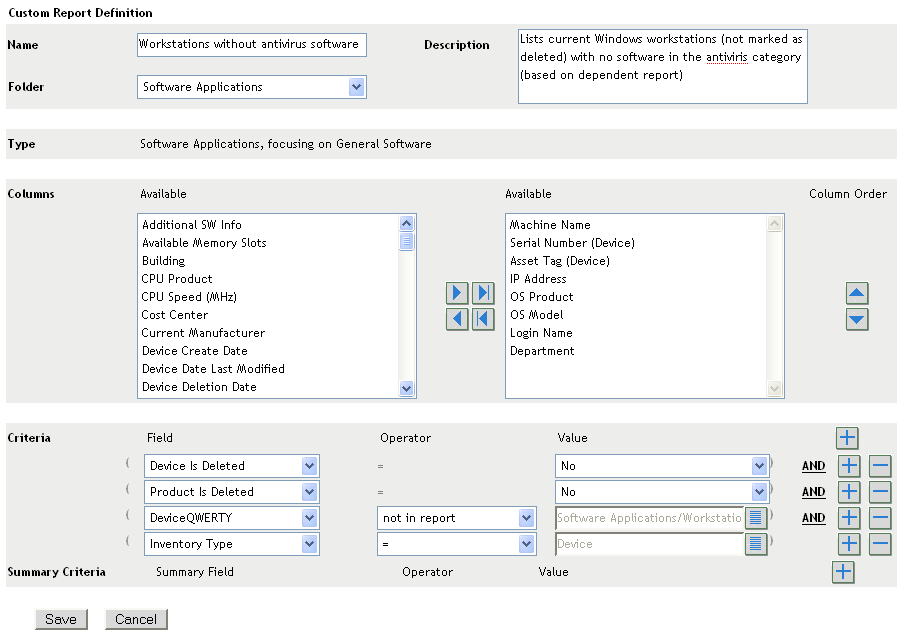 ZENworks Control Center allows you to create and run custom reports that you can use to analyze the inventory in your Management Zone. These sections provide more information: