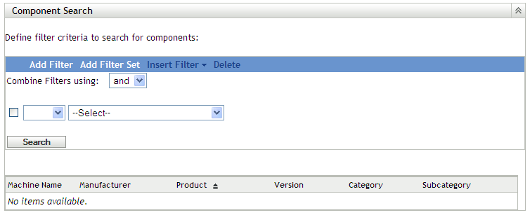 The Component Search panel allows you to select filters and filter sets to search for a particular component, then lists the components along with the following information:
