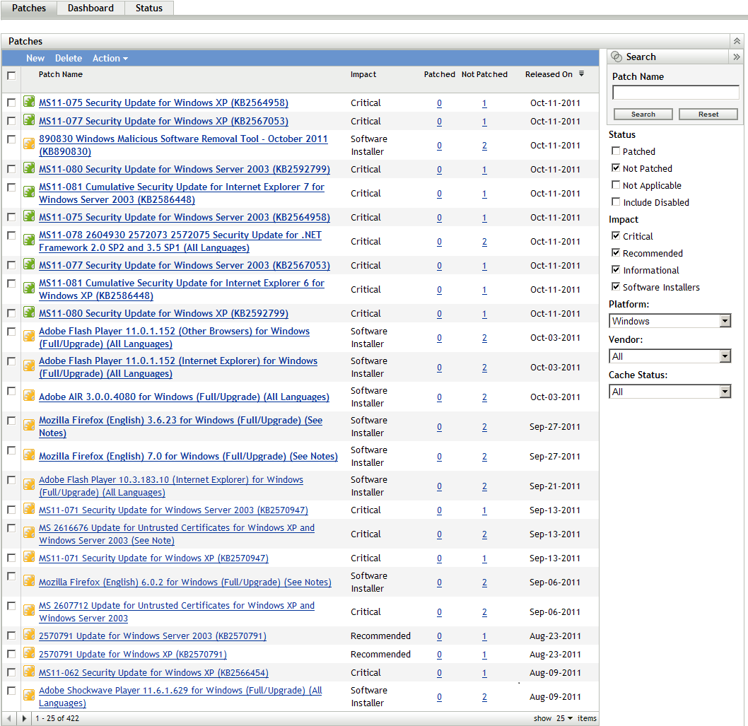 A patch consists of a description, signatures, and fingerprints required to determine whether the patch is applied or not patched. A patch also consists of associated patch bundles for deploying the patch.The Patches page displays a complete list of all known patches reported by various software vendors. After they are reported and analyzed, the patches are registered for distribution to your ZENworks Server through the ZENworks Patch Subscription Network. The ZENworks Adaptive Agent should be installed on each device to check for known patches. A patch bundle called Discover Applicable Updates (DAU) is then assigned to run on each device on a daily basis to scan for known patches. This task returns the results that are displayed on the Patches page. The results are presented in a table of patch status. The total number of patches is displayed below the table in the bottom left corner.