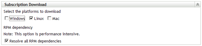 The RPM package manager (RPM) is a new feature which will only be enabled when you select the operating system platform for Linux. Now you can select the Linux check box, then you can select the Resolve all RPM Dependencies to download all the patches, as shown in the following image;
