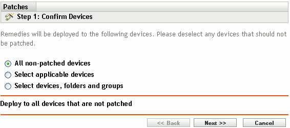 Choose All non-patched devices to deploy the patch to those devices that are in a non-patched state, then continue with Section 6.2.1, Confirm Devices: All Non-patched Devices.