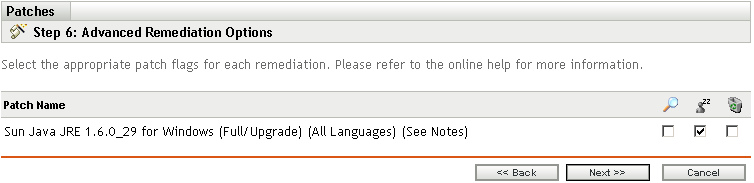 The Advanced Remediation Options page enables you to set patch flags for each remediation. Setting the patch flags for a selected patch is the sixth step in scheduling a deployment for the selected patch. The icons displayed on the page represent the patch flags that can be set for each package.