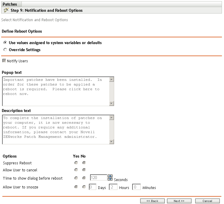 To complete the installation of patches to your computer, it is now necessary to reboot. If you require any additional information, please contact your Novell ZENworks Patch Management administrator. |