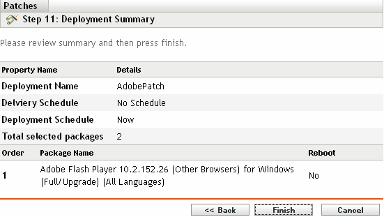 Click the Finish button to complete the process of scheduling the deployment of a selected patch. Click the Back button to return to the previous page. Click Cancel to exit the wizard.