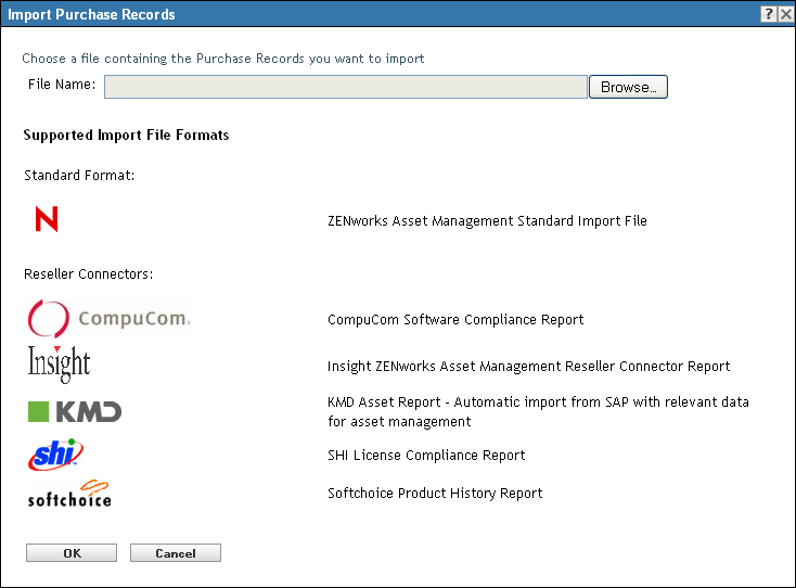 The easiest way to create purchase records is to import them from files supplied by resellers. Asset Management can import purchase records from CompuCom, Insight, KMD/SAP, SHI, and Softchoice. In addition, there is generic import format that you can use (see Working with Import Files).