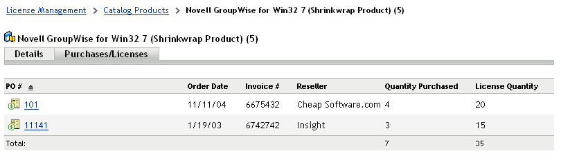 You can view a list of the purchase records from which the catalog product draws its purchased license quantity.