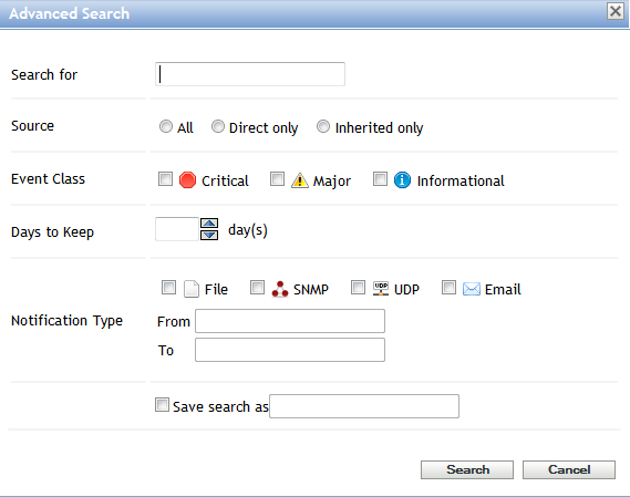 You can search for a specific event, or filter events based on category (Critical, Major, and Informational). You can also perform advanced searches and create, edit, and delete saved searches.