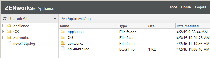 All log files that are monitored on ZENworks Appliance are organized in a virtual tree structure and path of the particular file or folder is displayed. Log files can be viewed in the Tail mode or View From Start mode.