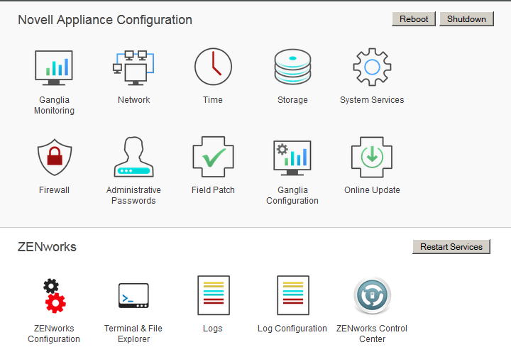 If you log in as a root or zenadmin user, the following options are displayed in the ZENworks section:
