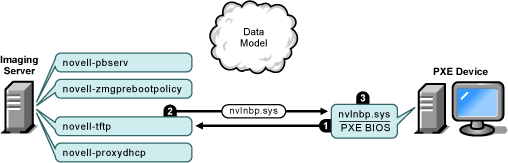 Nvlnbp.sys requests the Novell Preboot Services Menu configuration from the Data Model via novell-zmgprebootpolicy.