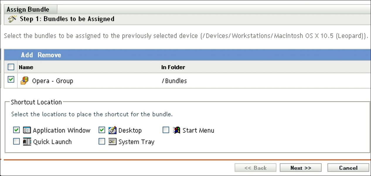 You can use the Shortcut Location assignments to specify the locations on the managed device where ZENworks Adaptive Agent displays the bundle’s icon.