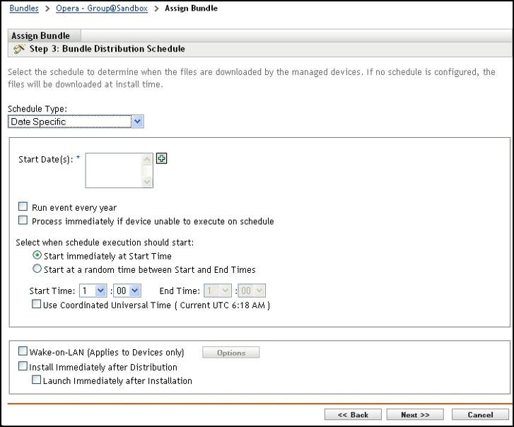 NOTE:If you are assigning bundles to Wake-on-Lan devices with Date Specific scheduling option, you need to enable the Process immediately if device unable to execute on schedule option. This is required for the distribution to occur on schedule after the device wakes and receives the bundle distribution schedule.