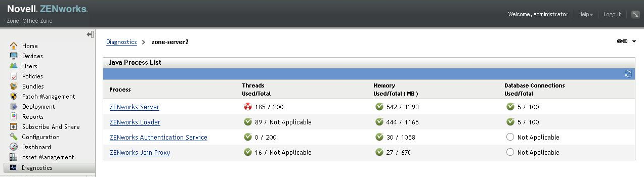 Threads Used / Total: The number of threads used by process compared to the maximum number of threads allowed by the thread pool in case of ZENworks Server and ZENworks Authentication Service. As ZENworks Loader and ZENworks Join Proxy do not use thread pools, this field shows the number of threads running. If multiple thread pools are configured, then this field shows the thread pool which is using maximum number of threads.