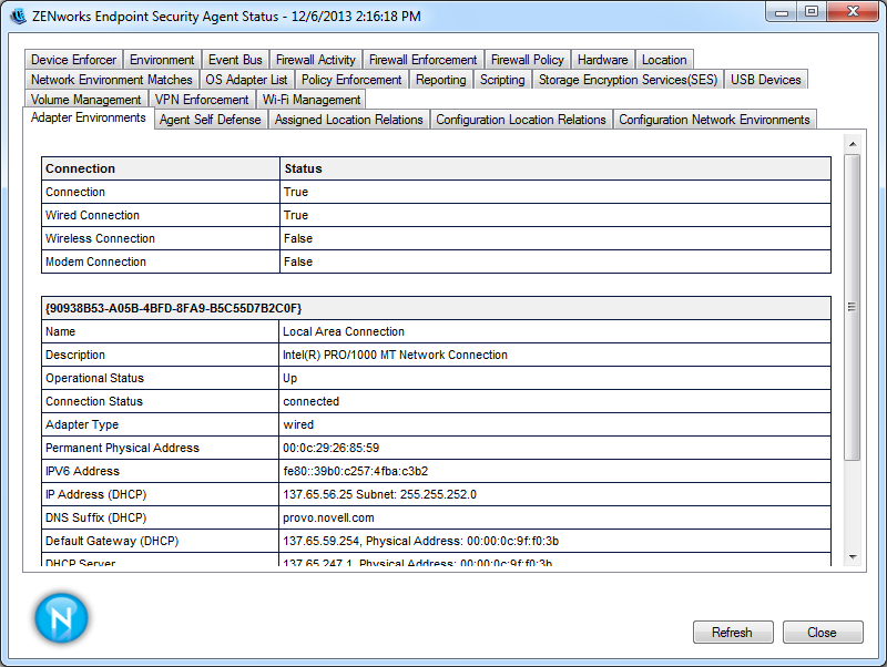 Specify the override password, then click OK to display the ZENworks Endpoint Security Agent Status dialog box.