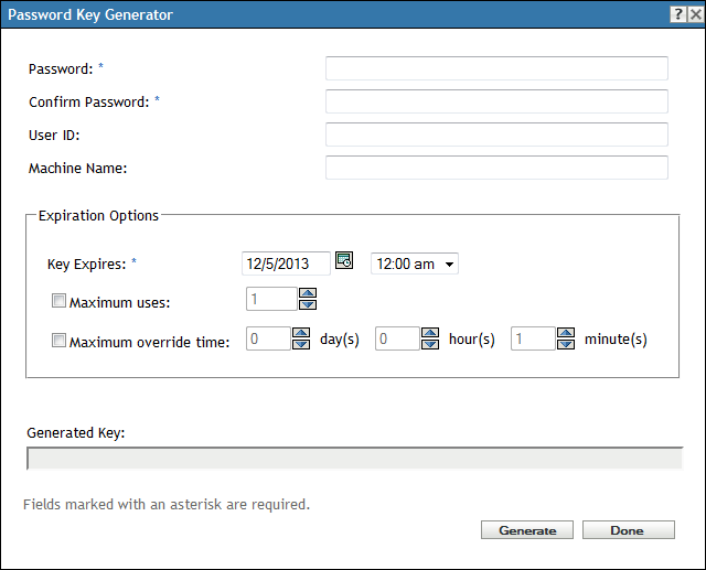 Under Configuration Tasks (in the left navigation pane), click Password Key Generator to display the following dialog box: