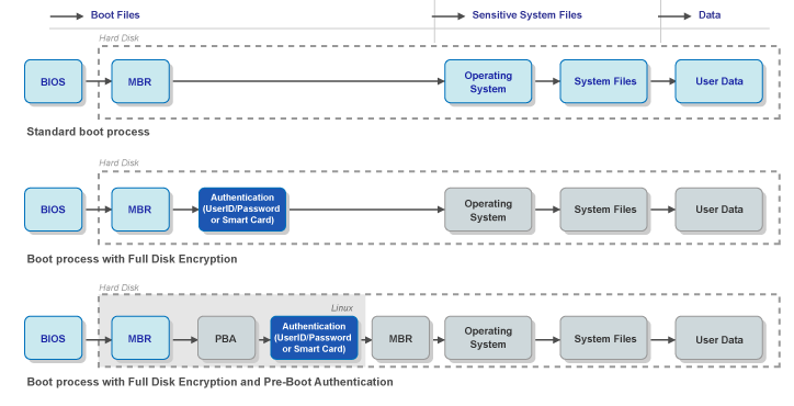 When the ZENworks PBA is installed, it changes the standard boot process. The following illustration shows the standard boot process (no disk encryption or pre-boot authentication), the boot process with disk encryption (no pre-boot authentication), and the boot process with disk encryption and pre-boot authentication.