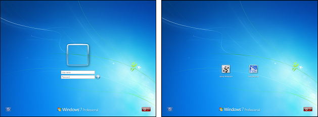 Single sign-on supports both the classic Logon screen mode (left screen shot) and the Welcome screen mode (right screen shot). As long as a device is using one of these two modes, single sign-on works as soon it is activated in the policy and the policy is applied to the device. Windows 7 is used in the example screen shots below, but Windows Vista and Windows XP also provide the classic Logon screen and Welcome screen modes.
