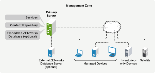 The Primary Server is the focal point of a Management Zone. Depending on the number and location of the devices that you want to manage with ZENworks, you might need one Primary Server or multiple Primary Servers.