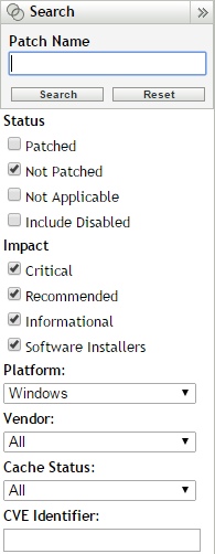 The Search section on the Patches page offers extensive search and data filtering options that allow you to search for specific patches and filter result sets based on the status and impact of the patches. Searching and filtering can be performed independently of each other or can be combined to provide extensive drill-down capabilities. The following figure shows the Patch Search section: