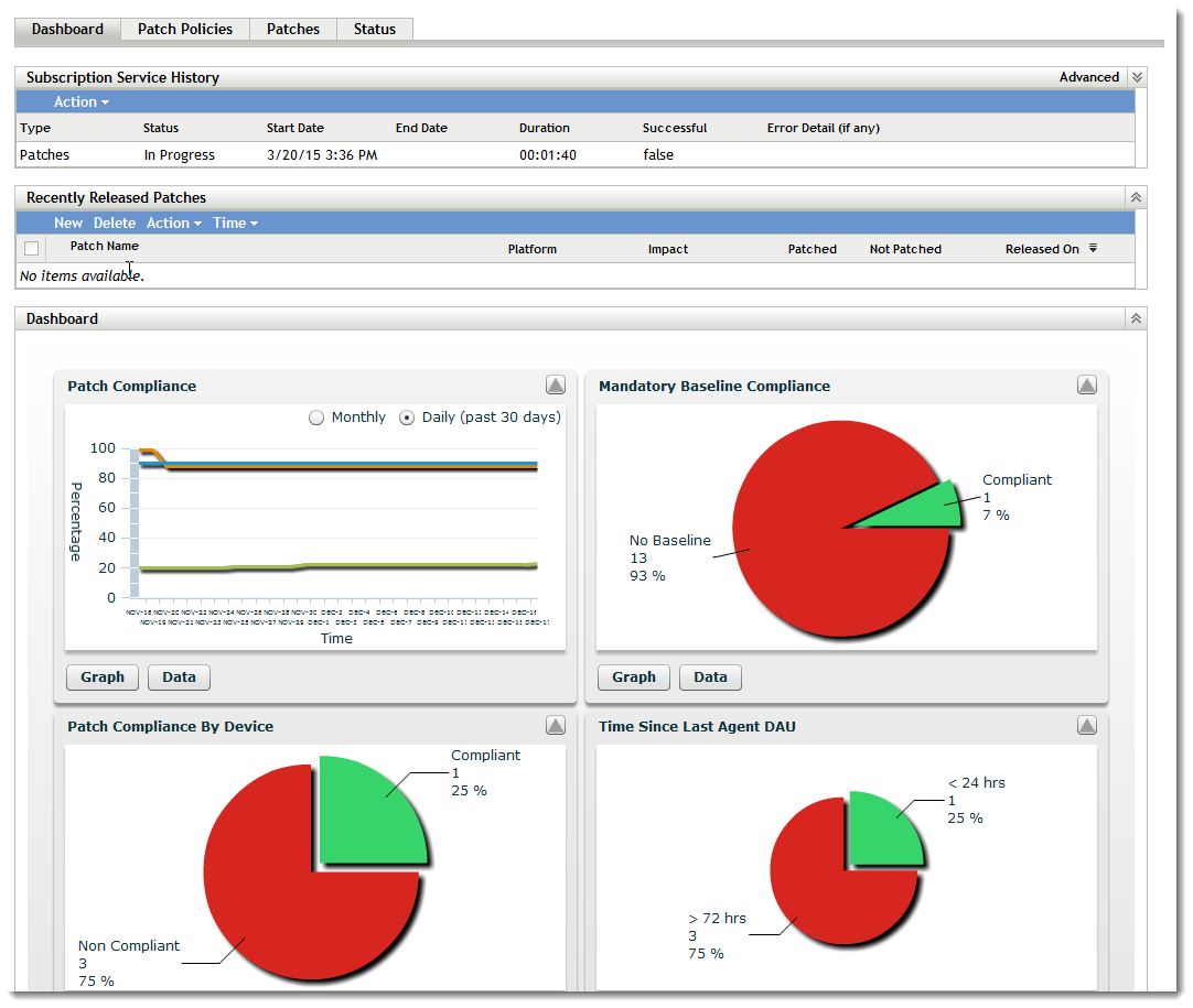 The Dashboard addresses operational, management, and compliance reporting needs with a graphical dashboard and four standard reports that document patches, patch deployments, patch status, trends, inventory and more, at individual machine or aggregated levels. This provides a unified view to demonstrate progress toward internal and external audit and compliance requirements. Clicking a dashboard report will display more information about that report in tabular form. You can update the dashboard by clicking the Update Dashboard Report button in the Action menu of the Patch Management tab.
