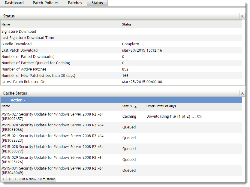 The Status page consists of the system and cache statuses, which show the overall patch information. For more information, see Status.