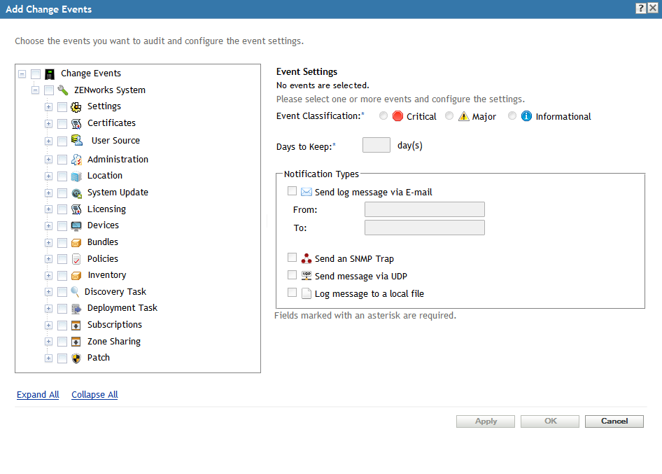 To audit an event, you must first enable the event in ZENworks Control Center. You can enable the event at the zone or device level. An event that is enabled at the zone level applies to all devices in the zone, and an event that is enabled at the device level applies to only the selected device.