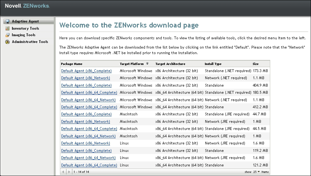 Network (.NET required): The network (.NET required) package installs only the pre-agent on the target device; the pre-agent then downloads and installs the ZENworks Adaptive Agent from the ZENworks Server. The network (.NET required) package requires that Microsoft .NET 4.0 or later is installed on the device prior to the deployment of the agent to the device.